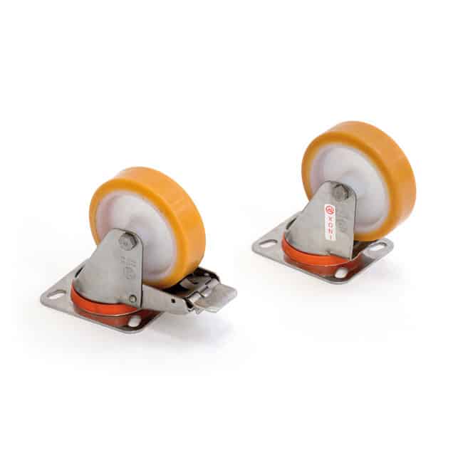 Kit compuesto por 2 ruedas giratorias y 2 ruedas giratorias con freno, soporte de acero inoxidable AISI 304L (Wnr 1.4307) y banda de rodadura de goma (peso máximo de 200 kg por rueda). Para usar debajo de cualquier armario, con o sin zócalo. Para el montaje, puede ser necesario realizar agujeros o fijar pernos electrosoldados; la preparación para ello se puede solicitar y realizar en fábrica.