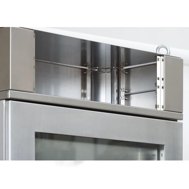 H=200 mm cable compartment in AISI 304L stainless steel (Wnr 1.4307), fine satin finish, Scotch-brite type, for mounting on the upper part of the cabinet to protect the power cables. Inspectable on all sides, closed with a flange on the upper part, with IP20 protection rating. In EGO and SPEED cabinets in a row, the side flanges must not be fixed so that the 2 adjacent compartments communicate.It can be used as a cable container or distribution bar or as a simple cover for devices mounted on the upper part. It has a system that allows the cabinet to be lifted using eyebolts placed on top of the compartment.